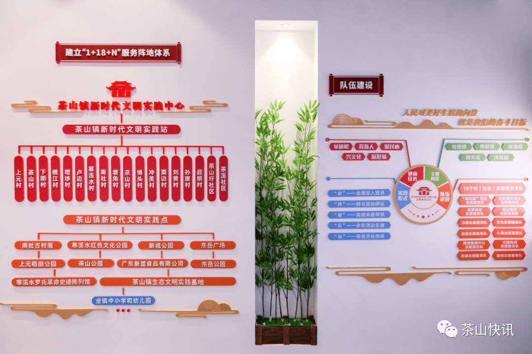 茶山通过镇村统筹构建“1+18+N”服务阵地体系,将文化服务中心大楼、党建广场、体育馆连片升级成为茶山镇新时代文明实践中心,并组建了“1+18+12”志愿服务队伍网络,立足群众多样化需求打造“志愿服务+”“你点单,我服务”“线上+线下”等服务模式。截至目前,茶山镇已建成1个实践中心、14个实践站,9个示范实践点,预计今年6月前全域建成实践站。更好地发挥新时代文明实践中心、站、点强信心、暖人心、筑同心的作用。
